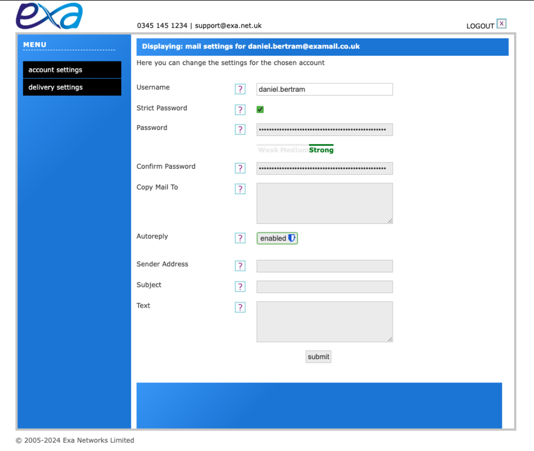 Note: Sender Address: This is where the reply will have come from. This should usually be set to the same as your primary email address, as any replies to the automatic email will be sent here.Subject: The subject of your choice.Text: The text that you wish to send automatically when autoreply is enabled. E.g. I am out of the office until Friday.