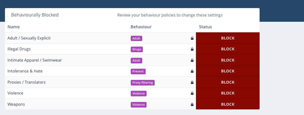 The first thing you will see is a list of categories that are blocked by your Umbrella Behaviour settings, with the middle column displaying the Umbrella Behaviour that the category falls under. For your protection, these cannot be unblocked here and must be done on the Umbrella Behaviour page.