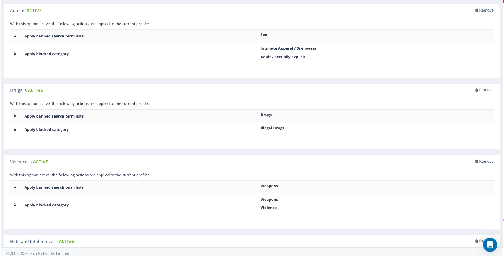 The Umbrella page shows the available behaviours and their current status. It also shows you the search term categories and website categories that are applied by each Behaviour. You can easily toggle whether a Behaviour is active or inactive by clicking the Remove icon.