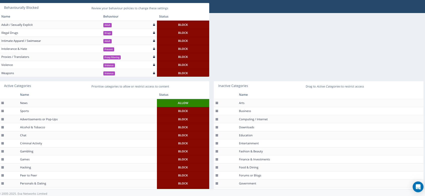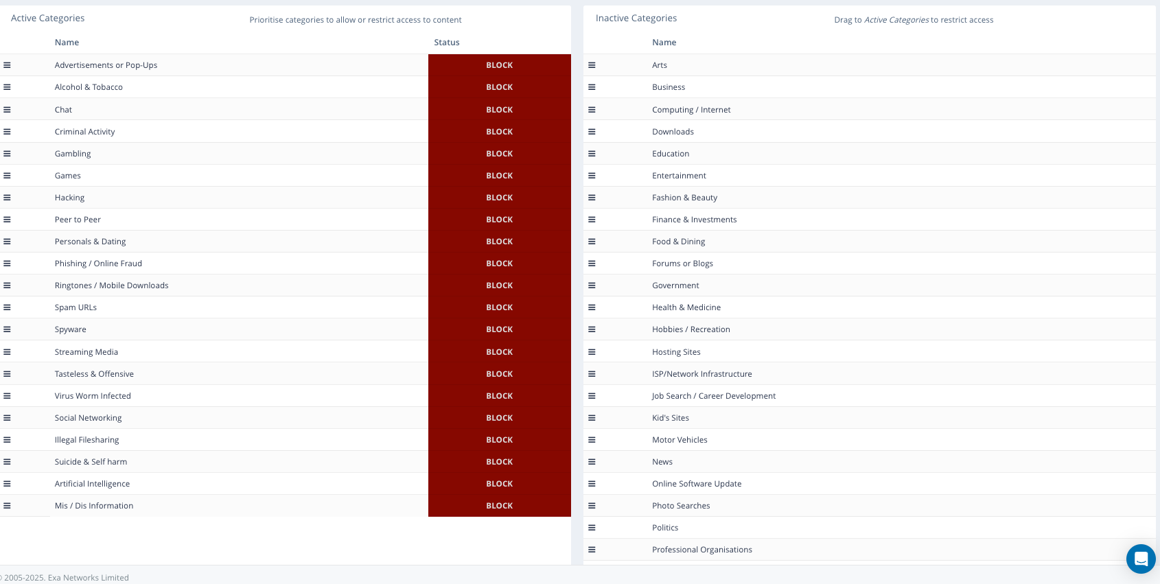 Back to the categories; Lower down the page shows the active categories and their current status. You can change the status between ‘Block‘ and ‘Allow‘ by simply clicking the status indicator. You can also add in any categories from the inactive categories list on the right-hand side by just dragging them over.