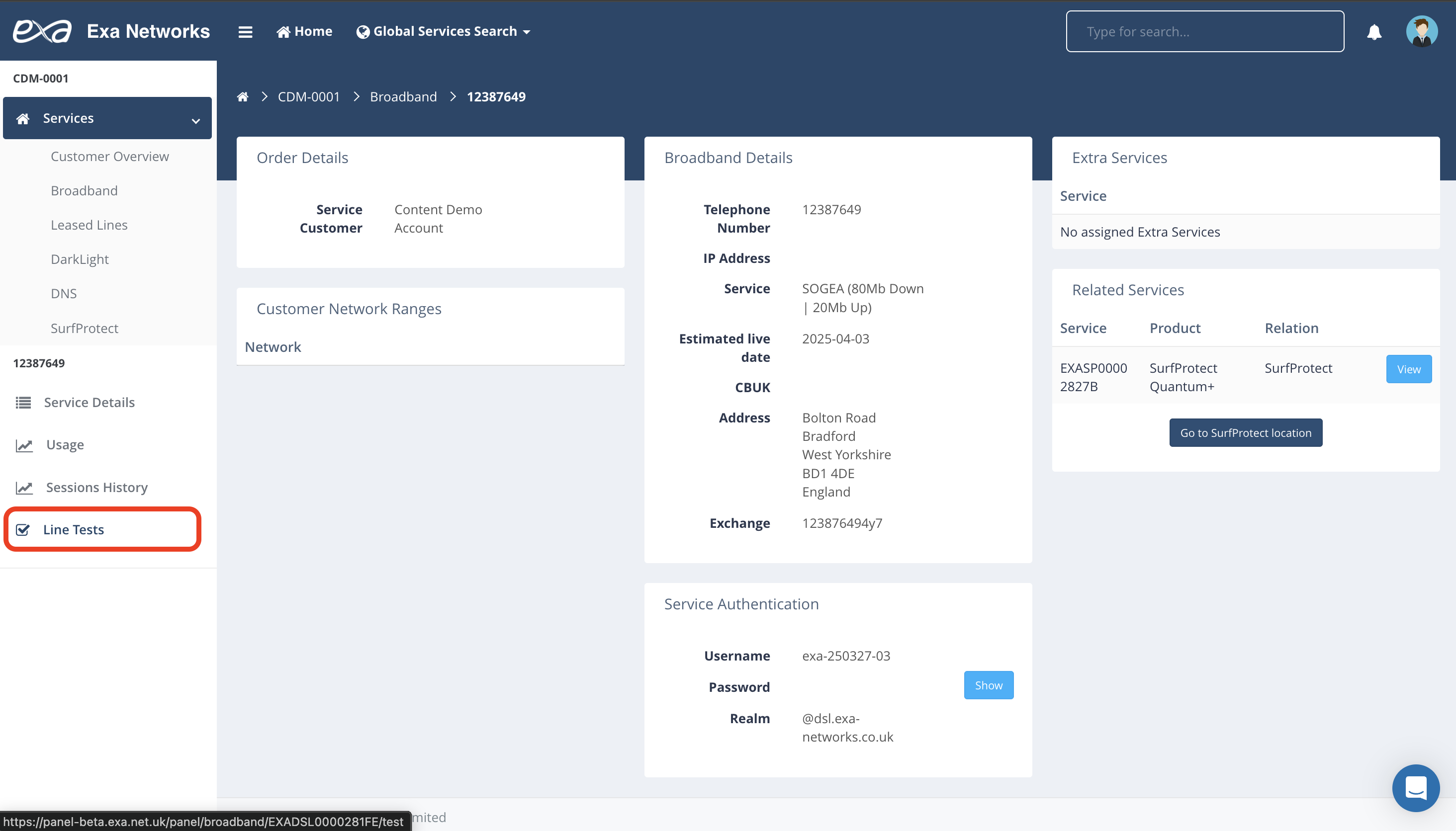 To begin a line test, you will first need to log into the Exa Panel and select the site you want to run the test for. Once selected, you will see Broadband as a choice on the left-hand side, and once chosen, the line test option will then be available on the left hand side: