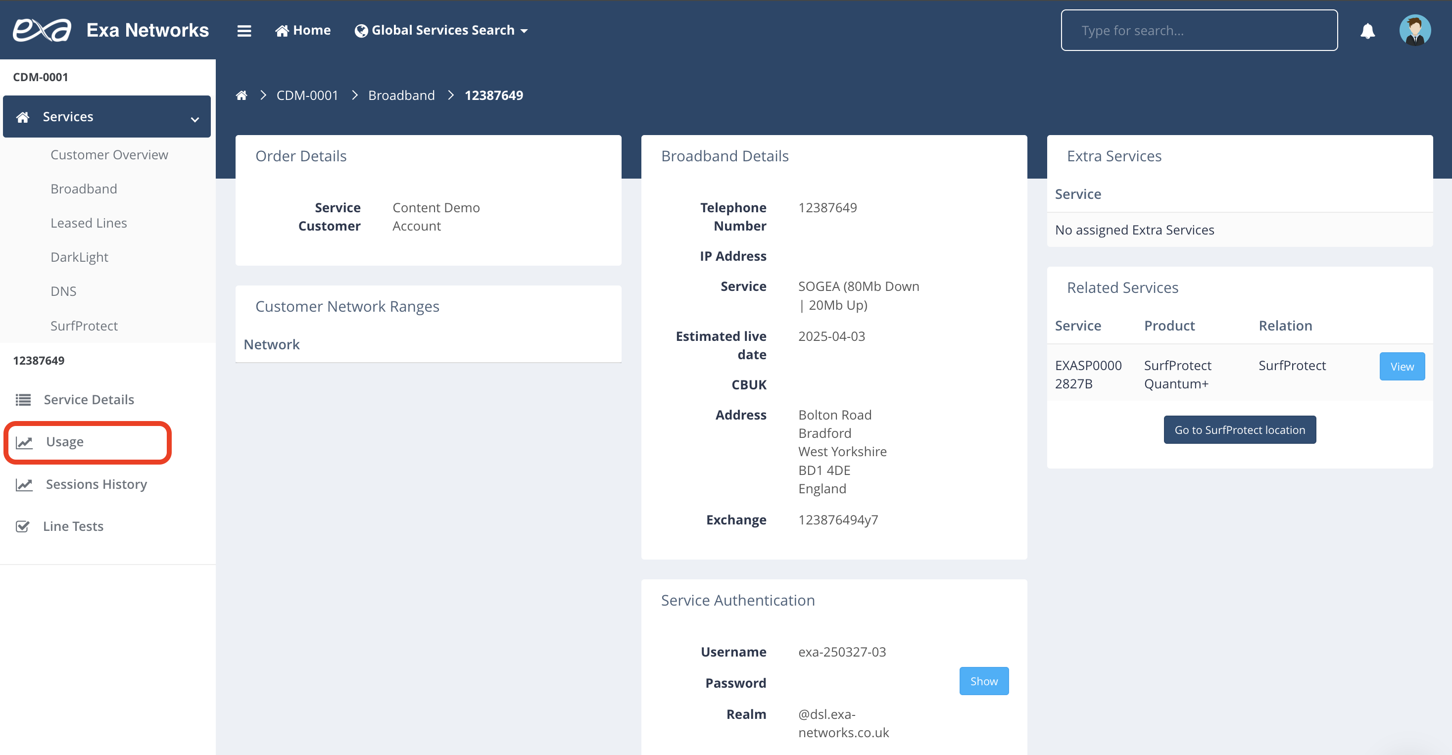 In order to check the usage you need to log into the Exa Panel, select the relevant site and choose Broadband on the left hand menu. You will then see usage as a selectable option: