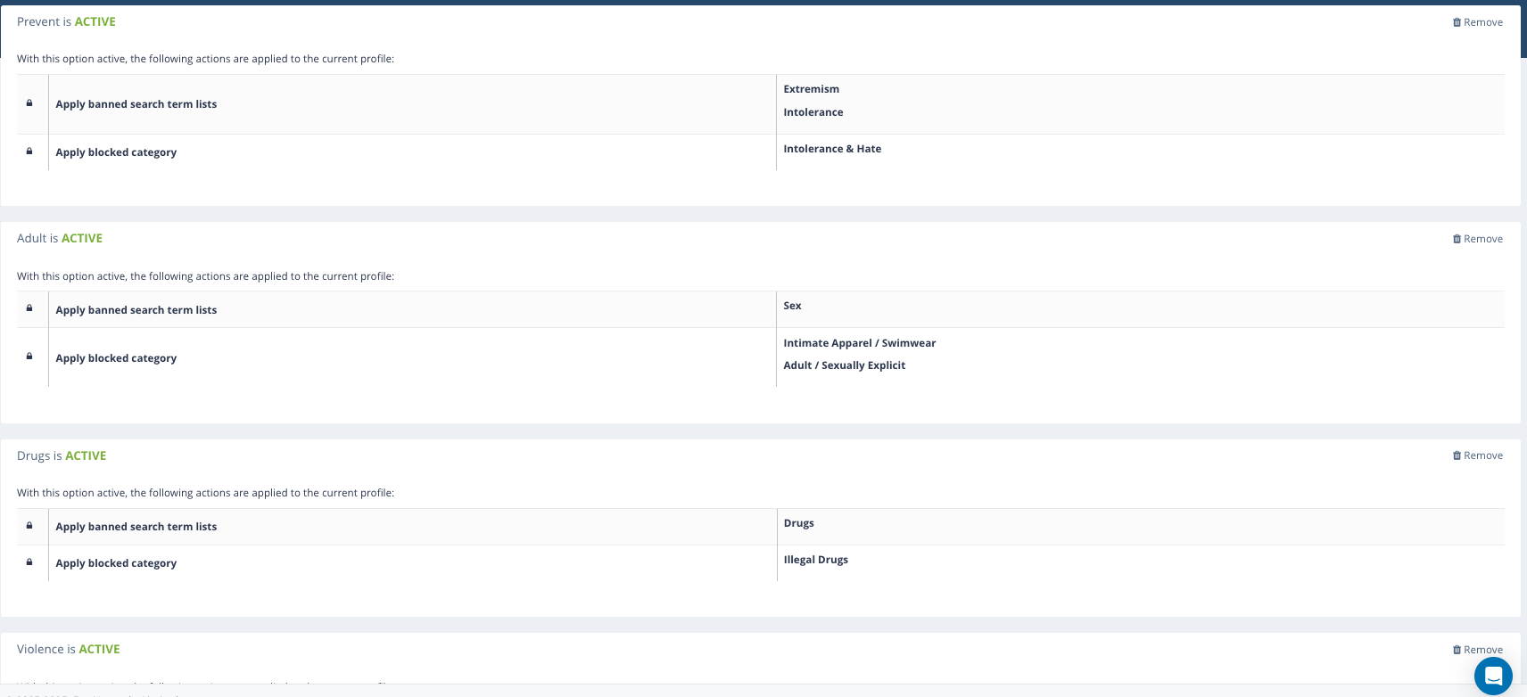 A feature of SurfProtect is the ability to apply a group of settings in one click. For example, you can apply all relevant settings for ‘The Prevent Duty’ by simply clicking the ‘Prevent’ Umbrella Behaviour.