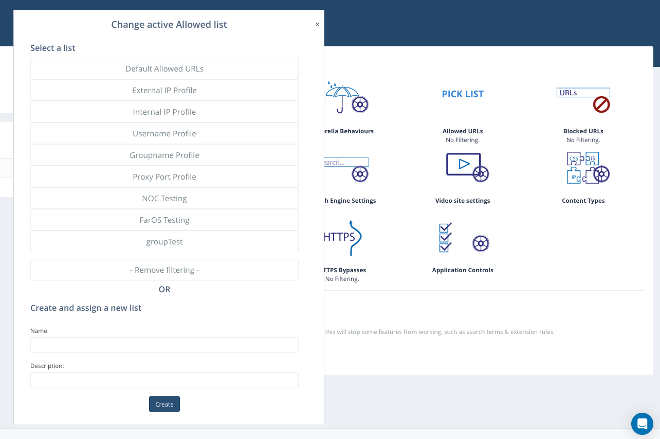 Blocked URLs work in much the same way as Allowed URLs above – you may become aware of a website that you do not want to be accessed on your connection, regardless of any filtering policies in place. To see what list is in use or to change it, hover over and select the relevant one.