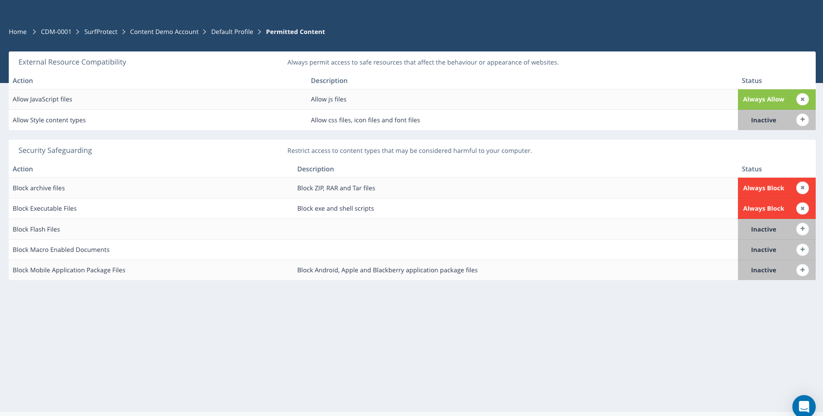 Note: By changing the status of either of these you are bypassing your current content-filtering policy and explicitly allowing this type of content to be downloaded regardless of their origin.