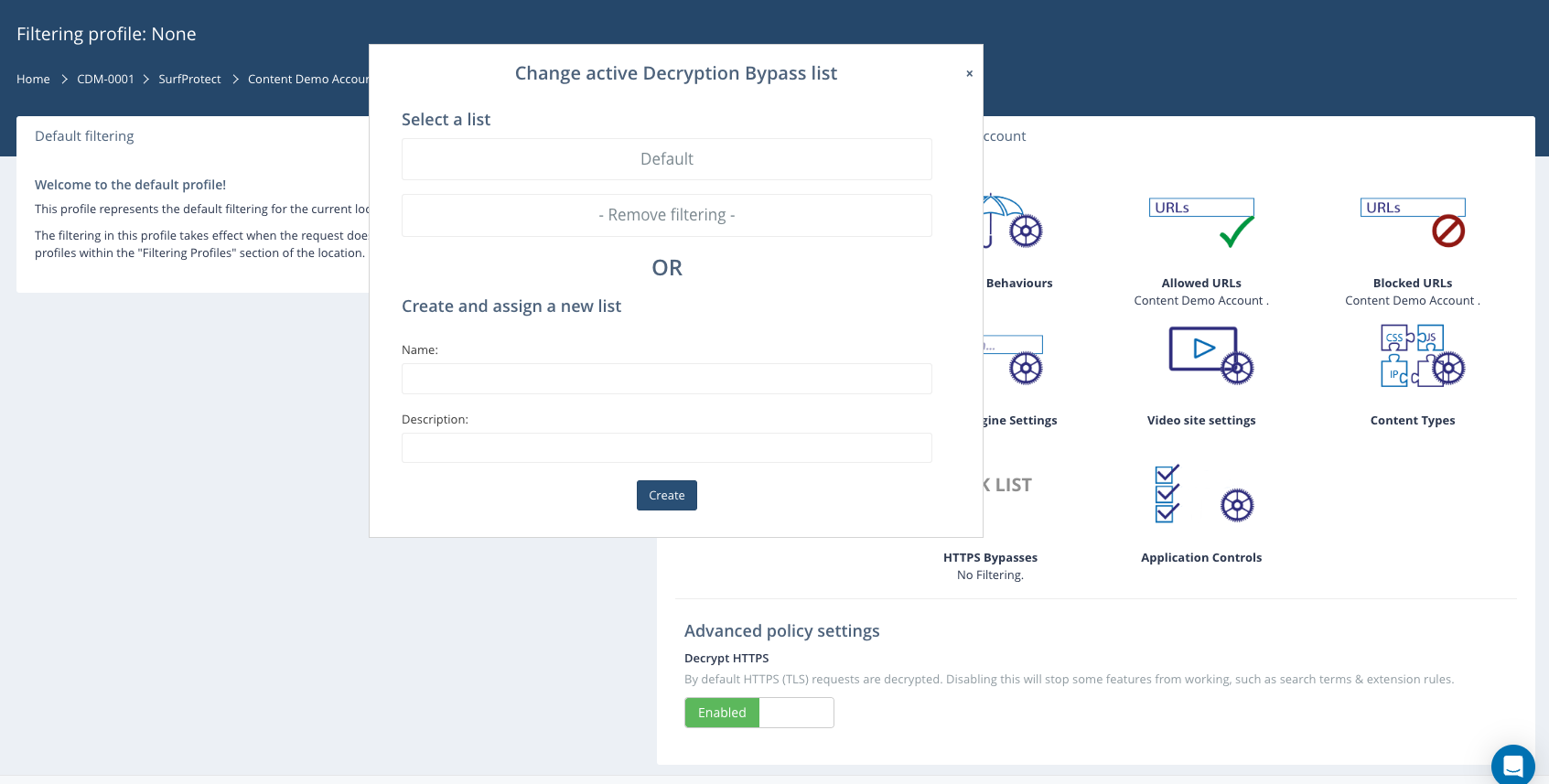 Underneath the icon, you will see which HTTPS Bypasses list is currently assigned. By hovering over the icon, you can then choose an alternative list to apply (including an option to remove all category filtering), or edit the current list.