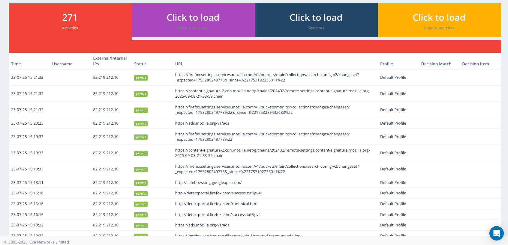 The final section of this page is the Activity logs themselves, which show data about every filtered web request that has been handled by your SurfProtect service. These logs are split into four tabs of data: